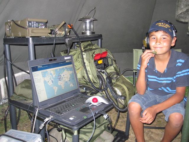 Trainee Michael DN1ZAV operating WSPR EmComm Center with Portable 13El.HF-Log-Periodic-Antenna & HF-Sloper-Antenna Portable EmComm Center at Night