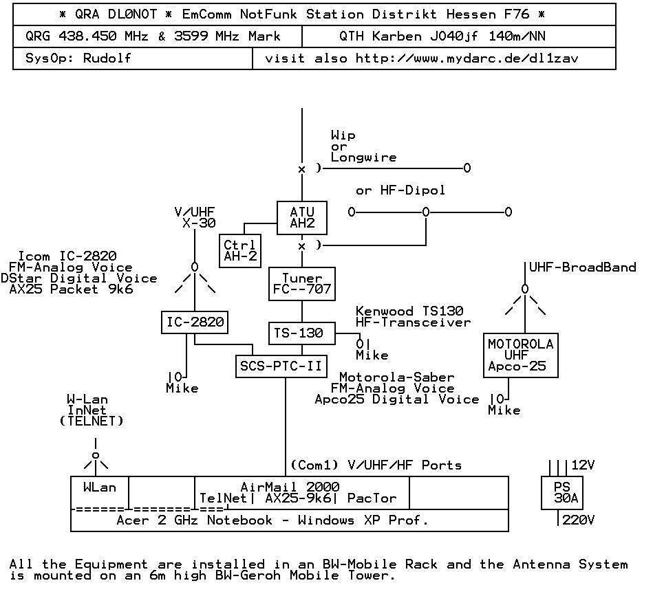 Portable EmComm PacTor/AX25 Data & Digital/Analog Voice Station Above Rack Diagramm below portable 6m Geroh Base with winch EmComm HF/VHF/UHF-Antennas on 6m Geroh Tower